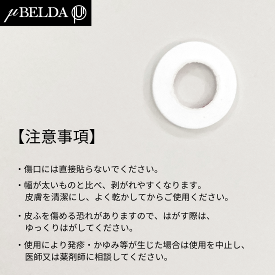 ・幅が太いものと比べ、剥がれやすくなります。皮膚を清潔にし、よく乾かしてからご使用ください。 ・傷口には直接貼らないでください。 ・使用により発疹・かゆみ等が生じた場合は使用を中止し、医師又は薬剤師に相談してください。 ・皮ふを傷める恐れがありますので、はがす際は、ゆっくりはがしてください。